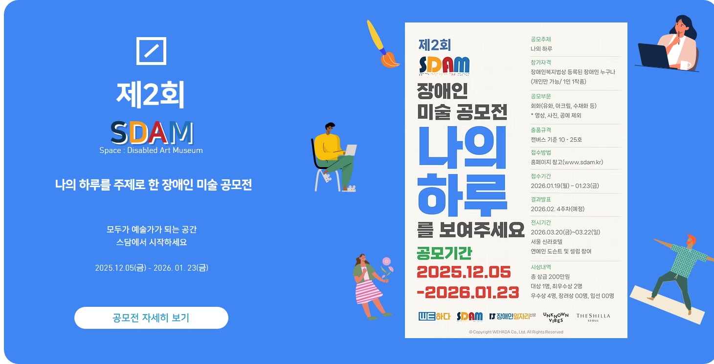 장애인 고용 플랫폼 기업 WE하다가 주최하고 장애 예술가 플랫폼 SDAM, 장애인일자리신문이 주관하는 이번 공모전은 ‘나의 하루’를 주제로 장애인 예술가들이 일상 속에서 경험하는 순간들을 자유롭게 표현한 작품들을 모집한다.