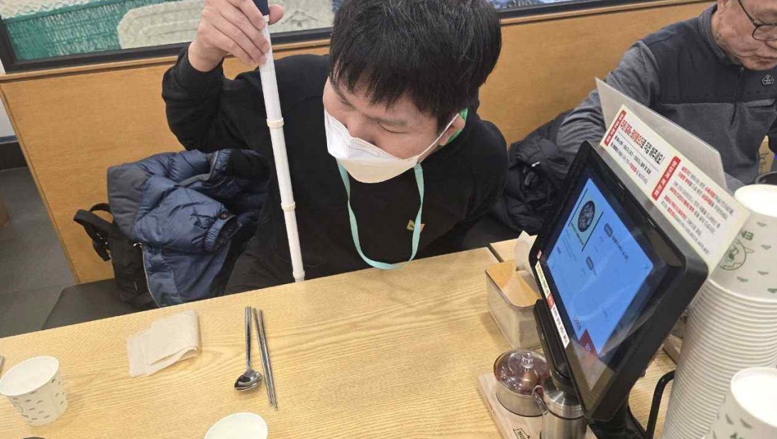 음성안내·접근공간 의무를 ‘호출벨’로 대체… “동등한 이용권 박탈”기술적 개선 대신 ‘인력 지원’ 택일 구조… 정부의 행정 책임 회피 지적 무인정보단말기(테이블오더형)를 통해 주문을 하려는 시각장애인. 음성이 전혀 제공되지 않아 기기 위치나 주문시…