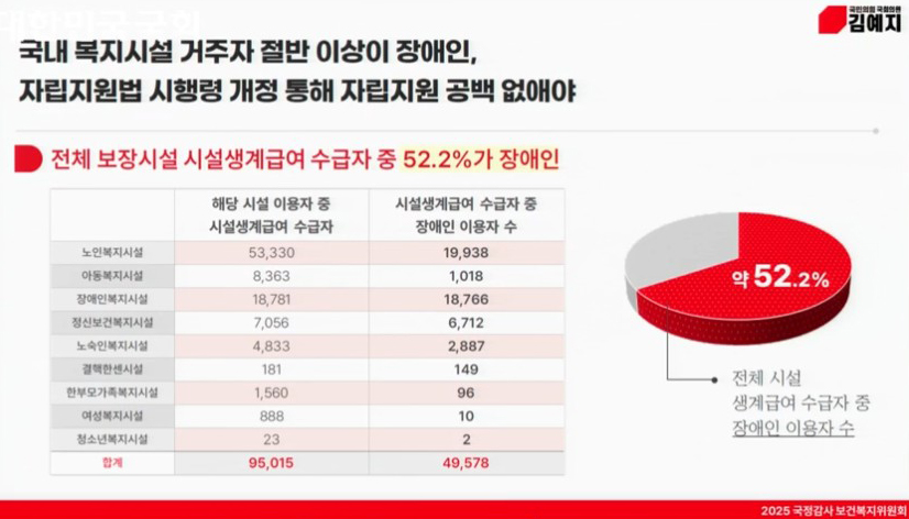 김 의원은 이날 감사에서 “장애인이 꼭 장애인복지시설에만 사는 게 아니다”라며 “복지시설별 법체계가 달라 장애인복지법상 보호·지원 체계가 적용되지 않는 이들이 많다”고 지적했다. 김 의원에 따르면 현재 약 3만800명의 장애인이 다양한 거주시설에 거주 중이며, 전체 보장시설 생계급여 수급자 9만5천15명 중 52.2%가 장애인으로 추산된다. 그는 특히 노숙인복지시설의 경우 “거주자의 절대다수가 장애인”이라며 “이들이 나가면 시설 존폐가 위태로울 정도”라고 강조했다.