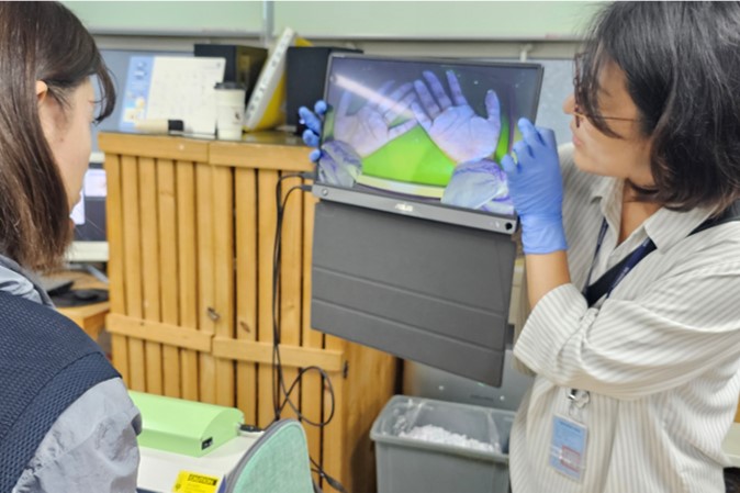 경기도는 9월 15일 부터 10월 15일까지 도내 4개 장애인직업재활시설 이용 장애인과 종사자등 약 200명을 대상으로 식품안전교육을 실시했다. 교육에 참가한 한 종사자가 자신의 손을 점검한 사진을 들여다 보는 모습.