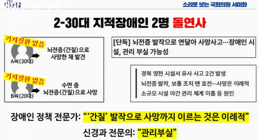서 의원은 이어 “인천의 한 거주시설에서는 여성 중증장애인 13명이 시설장에게 성폭행을 당했다”며 “가해자는 법인 대표이자 인천장애인거주시설협회 회장으로, 사건 후에도 계속 출근했다”고 비판했다. 이에 정은경 복지부 장관은 “중대한 인권침해로 판단해 시설 폐쇄와 법인 허가 취소까지 검토할 수 있다”며 “피해자 보호와 수사 결과에 따라 엄정히 조치하겠다”고 답했다.