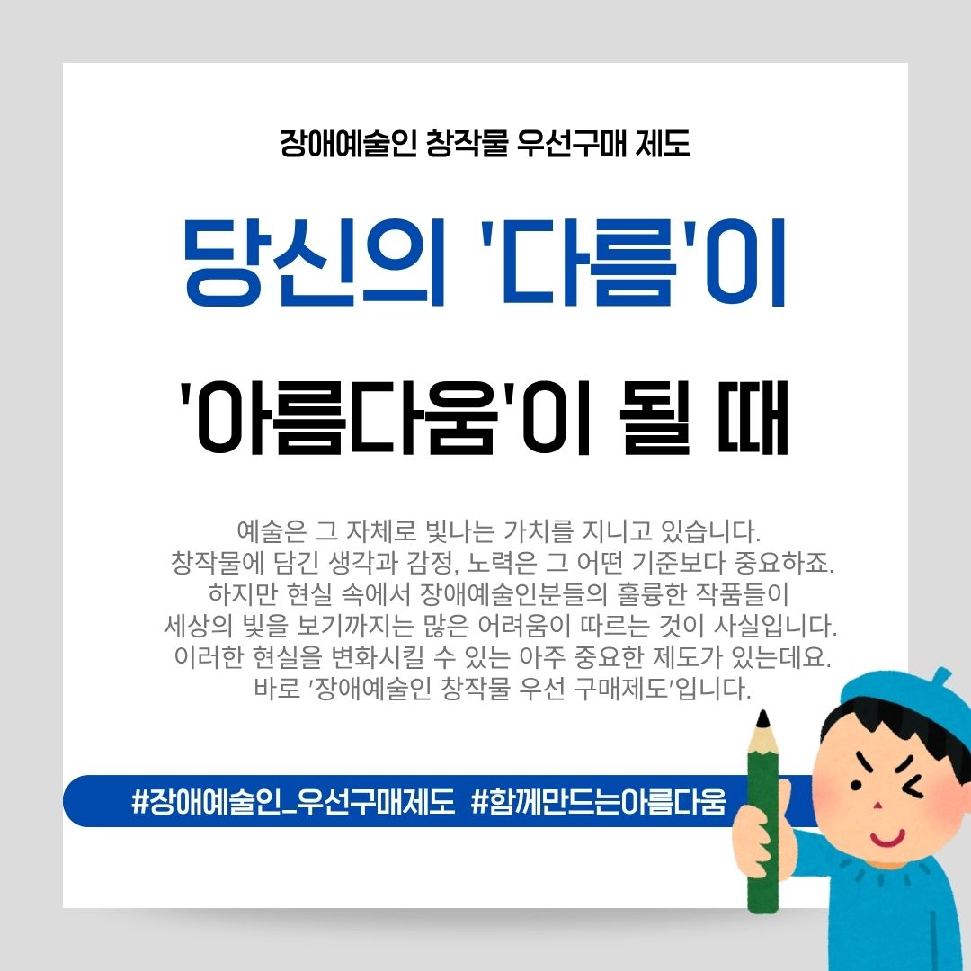 포토뉴스 [카드뉴스] 장애예술인 창작물 우선구매제도-당신의 ‘다름’이 ‘아름다움’이 될 때 김선영 기자(ksy@kdjob.co.kr) 2025년 10월 13일 0 김선영 기자(ksy@kdjob.co.kr) 글쓴이의 글 보기