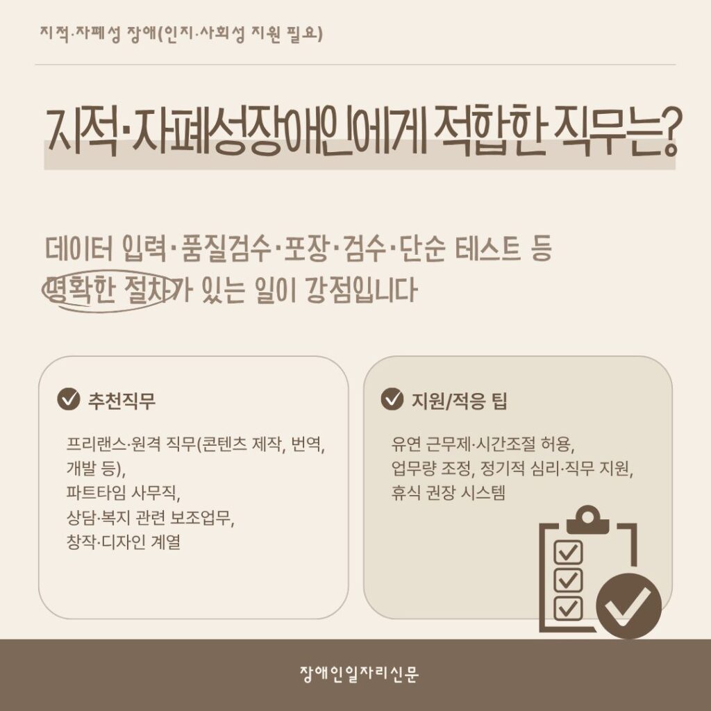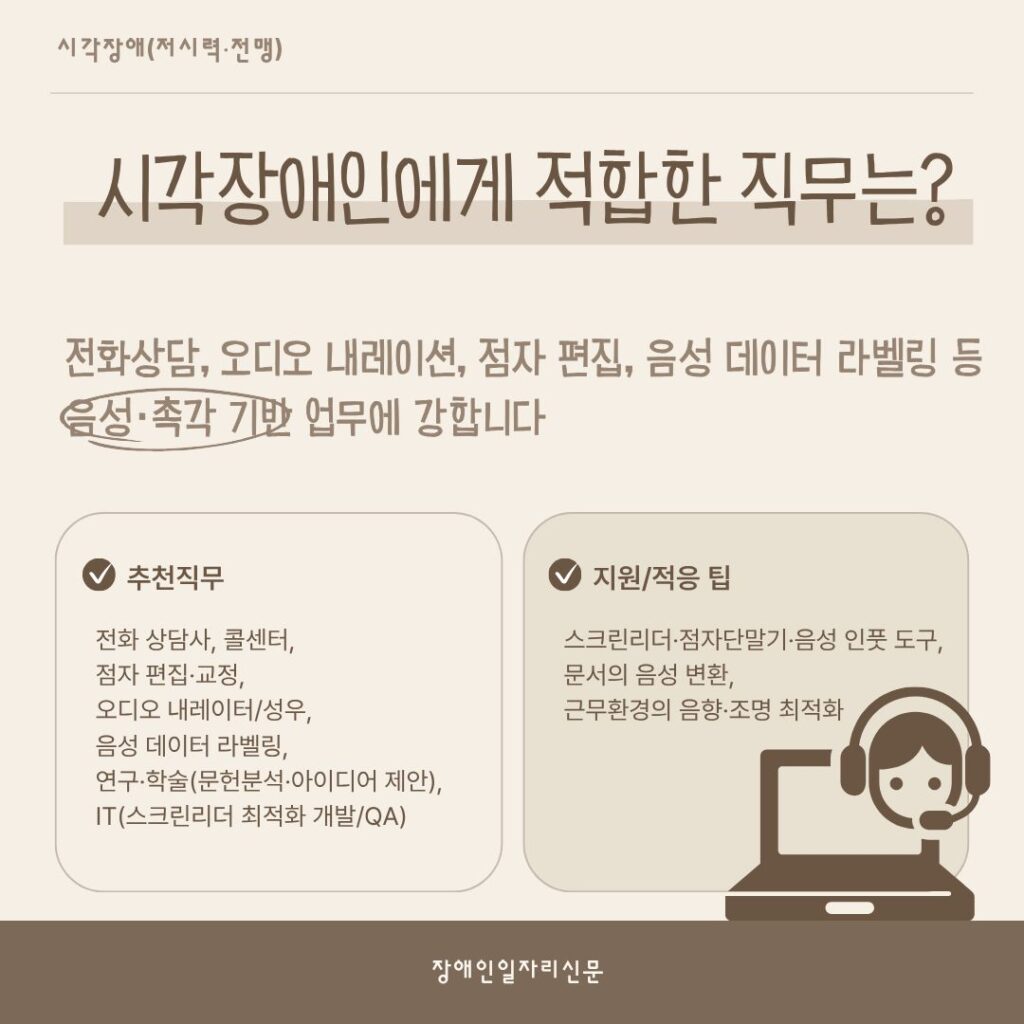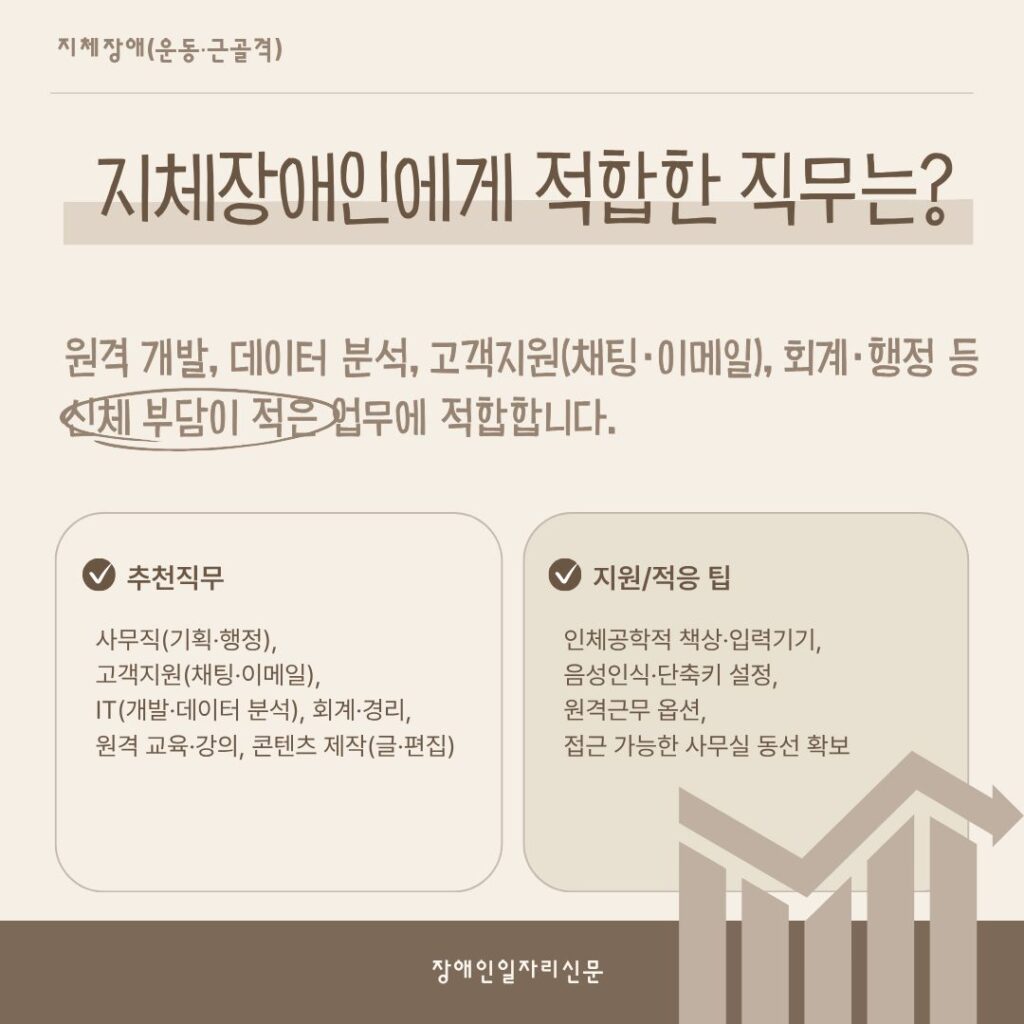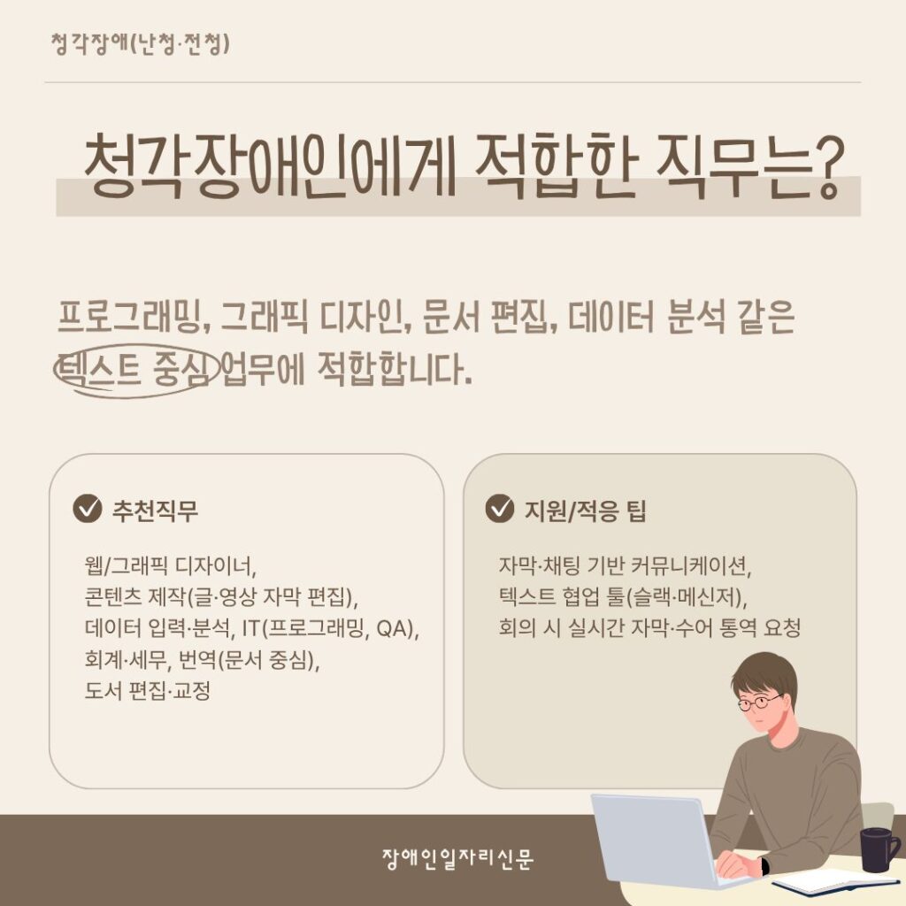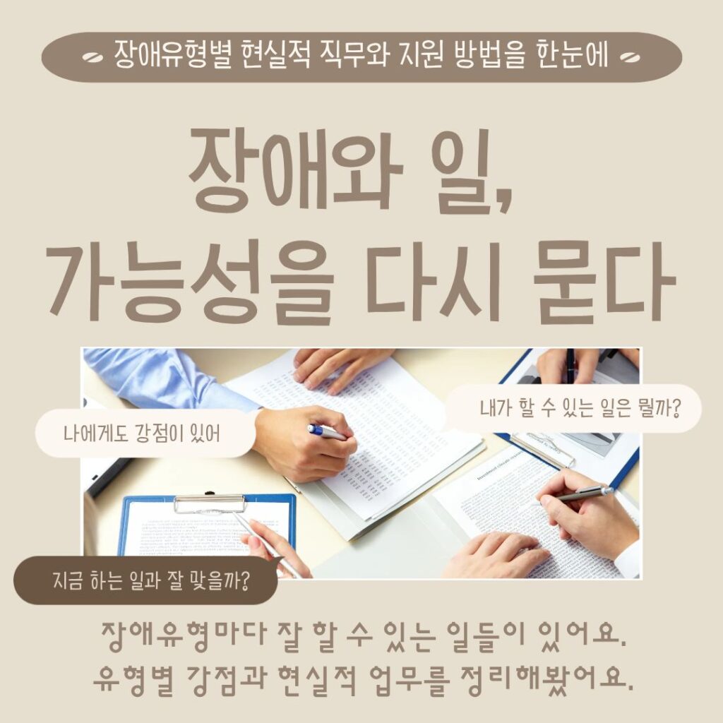 [카드뉴스] 장애와 일, 가능성을 다시 묻다 Posted on 2025년 10월 20일2025년 10월 20일 장애유형별 현실적 직무와 지원 방법을 한눈에 김선영 기자(ksy@kdjob.co.kr) 글쓴이의 글 보기