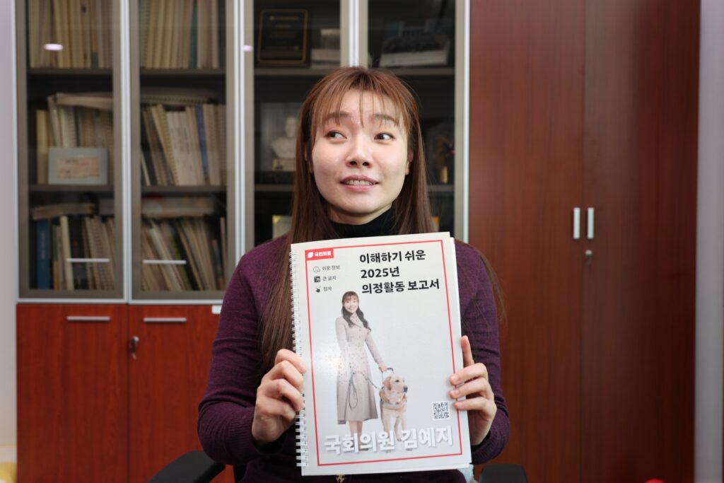시각장애인 당사자로서 장애인 인권과 정보 접근성 향상에 앞장서 온 국민의힘 김예지 의원이 2025년 의정활동을 담은 ‘배리어프리(Barrier-free·장벽 없는) 의정보고서’를 발간했다. 단순히 성과를 나열하는 관행에서 벗어나, 발달장애인부터 고령층까지 누구 하나 소외되지 않고 의정 활동을 이해할 수 있도록 문턱을 낮췄다는 평가가 나온다.