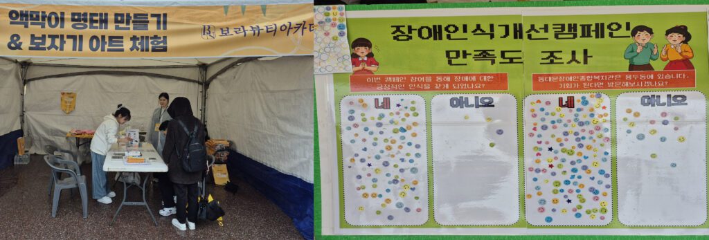 현장 한쪽에서는 휠체어슬로프차 탑승 체험이 진행됐다. 처음 접해보는 시민들은 탑승 순서를 기다리며 설명을 들었다. 시각장애인 안마 체험 부스도 꾸준히 방문객이 찾았다. 보자기 아트와 액막이 명태 만들기 체험은 문화 프로그램을 찾은 가족들에게 인기가 있었다. 일상 속 배리어 프리 찾기 부스에서는 시민들이 안내판과 사진 자료를 살펴보며 생활 속 접근성을 확인했다.